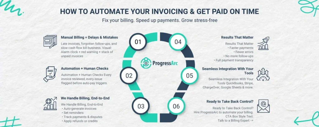 A lot of businesses think that automating billing is as easy as clicking a button. The truth is that you need a plan, regular reviews, and consistency. At ProgressArc, we don’t just monitor your system, we automate your invoices for real. Before every payment is made, our professionals check subscriptions, custom billing notes, and the history of the client. This evaluation before auto-pay lowers the risk of mistakes, disagreements, or requests for refunds.
